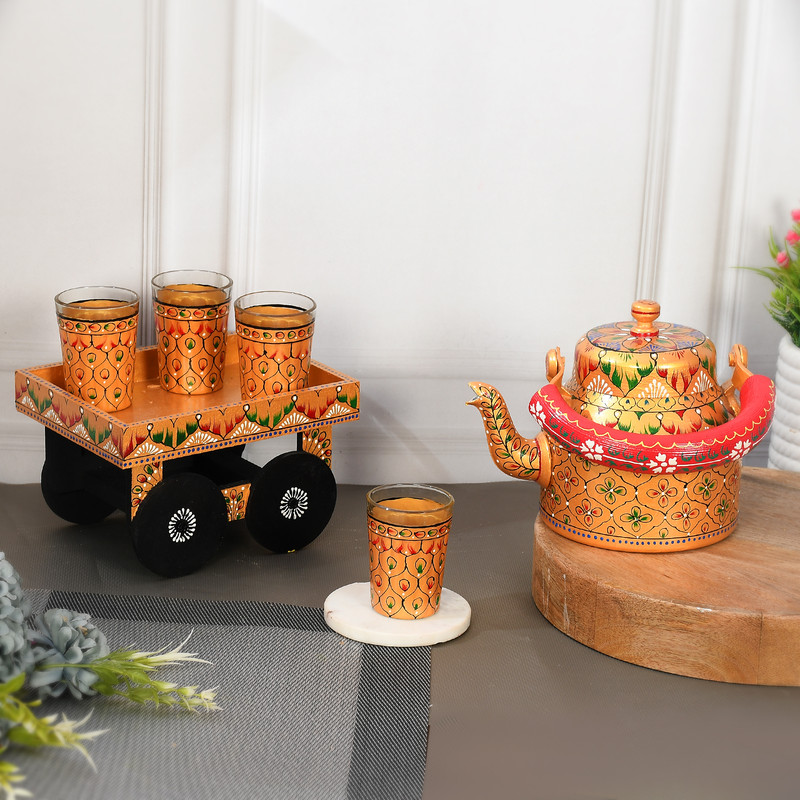 HandPainted Alluminium Tea Kettle with Four Glasses and Wooden Tray For Home D?cor , Tea Party , Serving